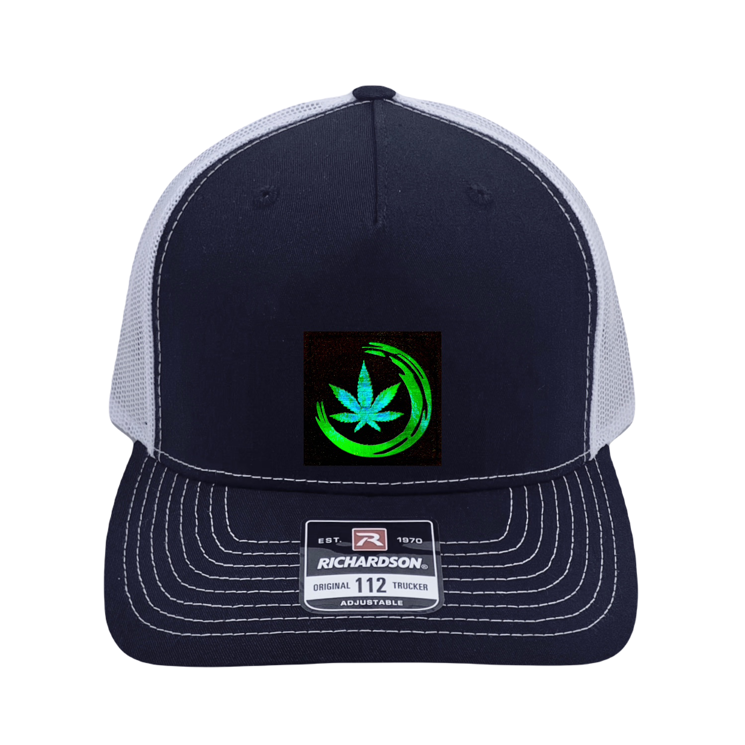 Richardson 112 original trucker hat, black/white five panel with black and holographic green hand made vegan leather Zen Cannabis