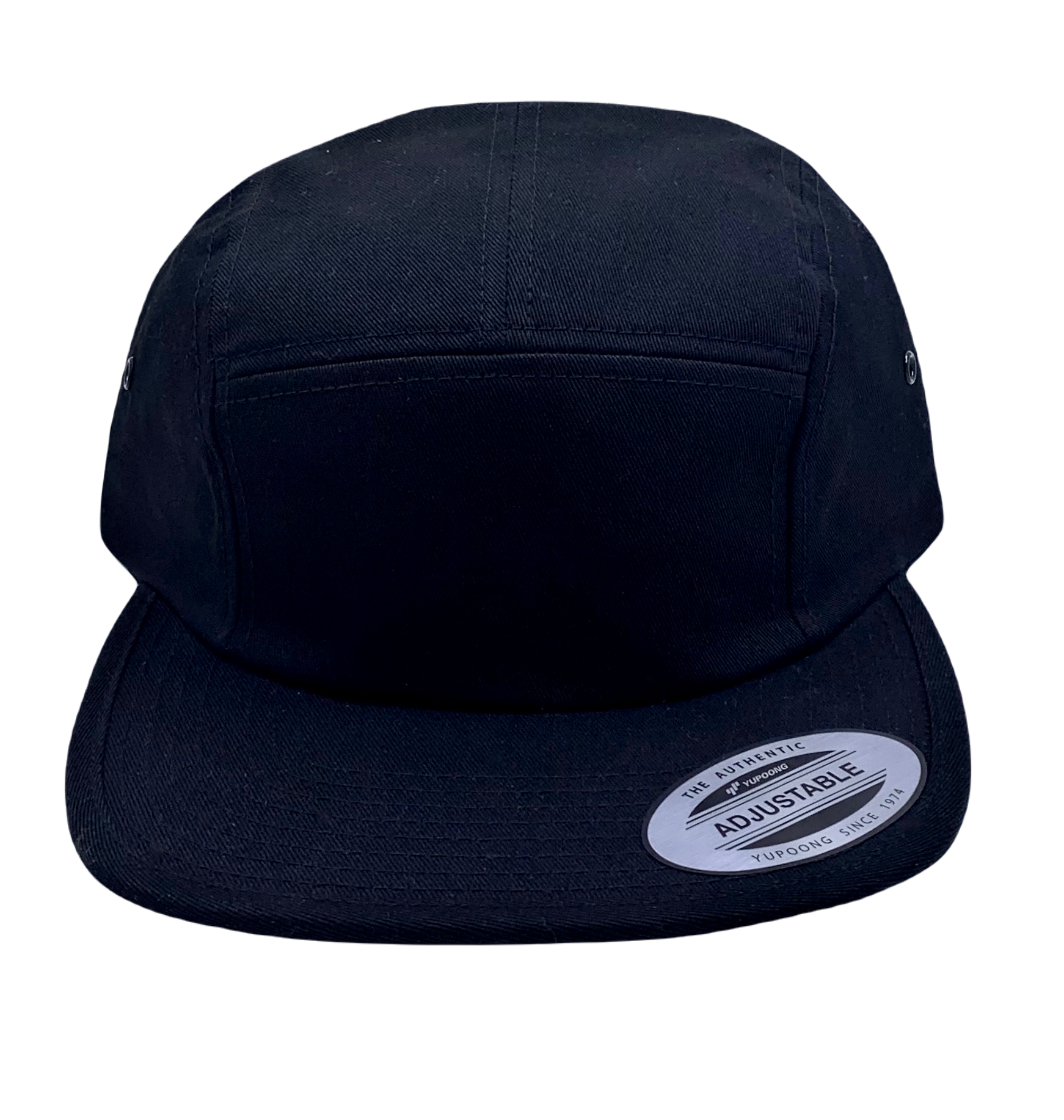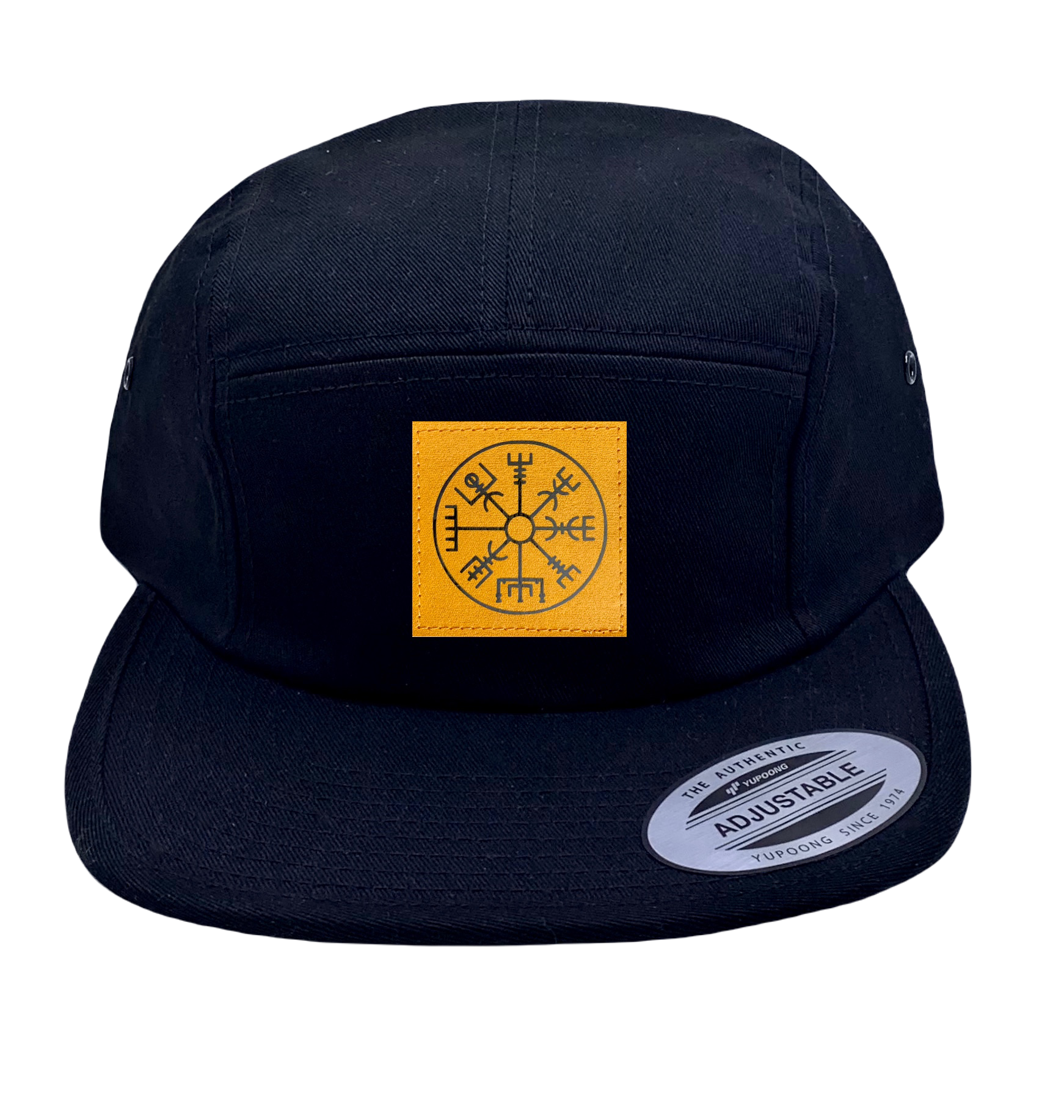 Black Yupoong 5 panel jockey flat bill hat cap with hand made black - mustard vegan leather Norse Viking compass Vegvísir - flat bill visor.