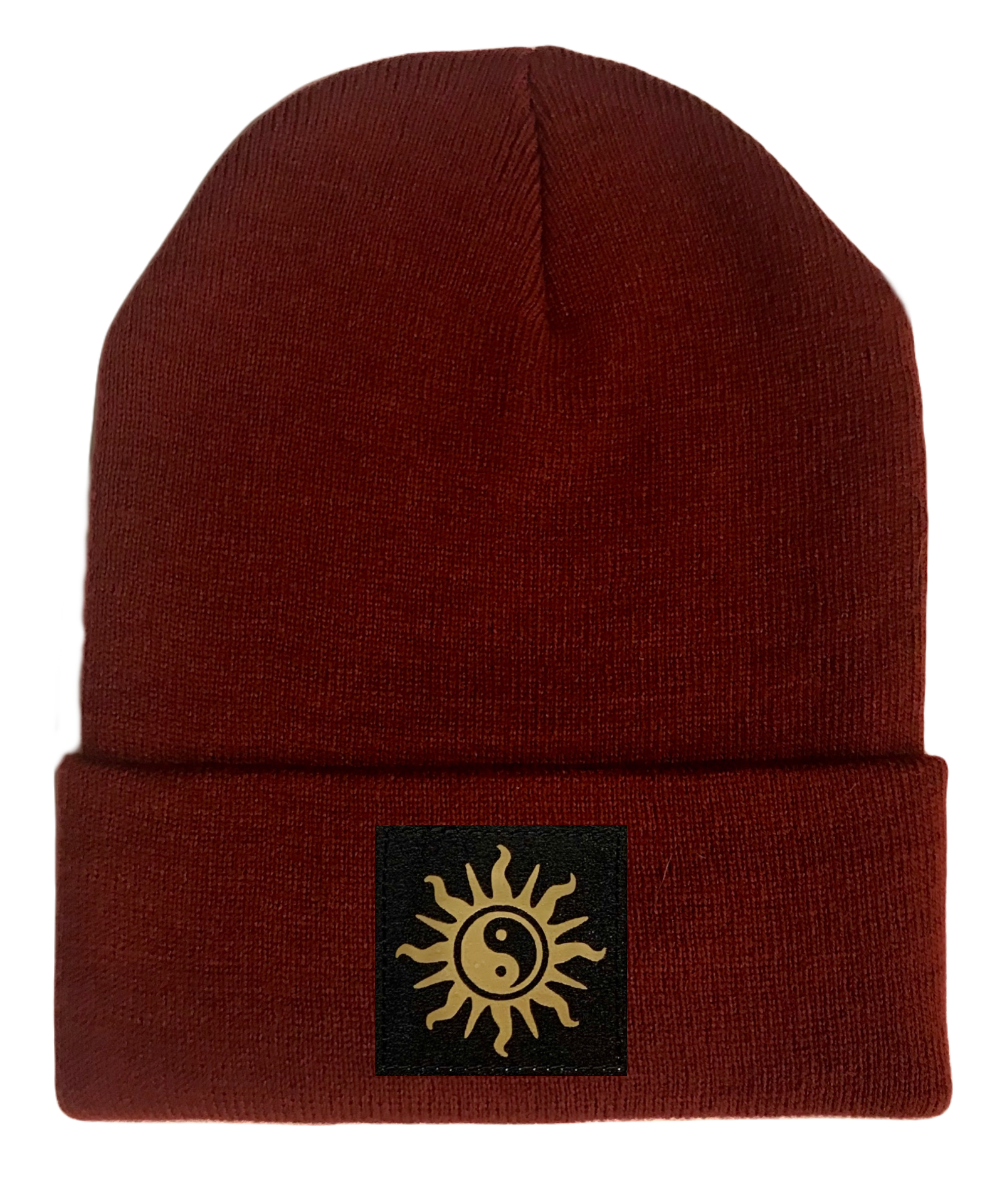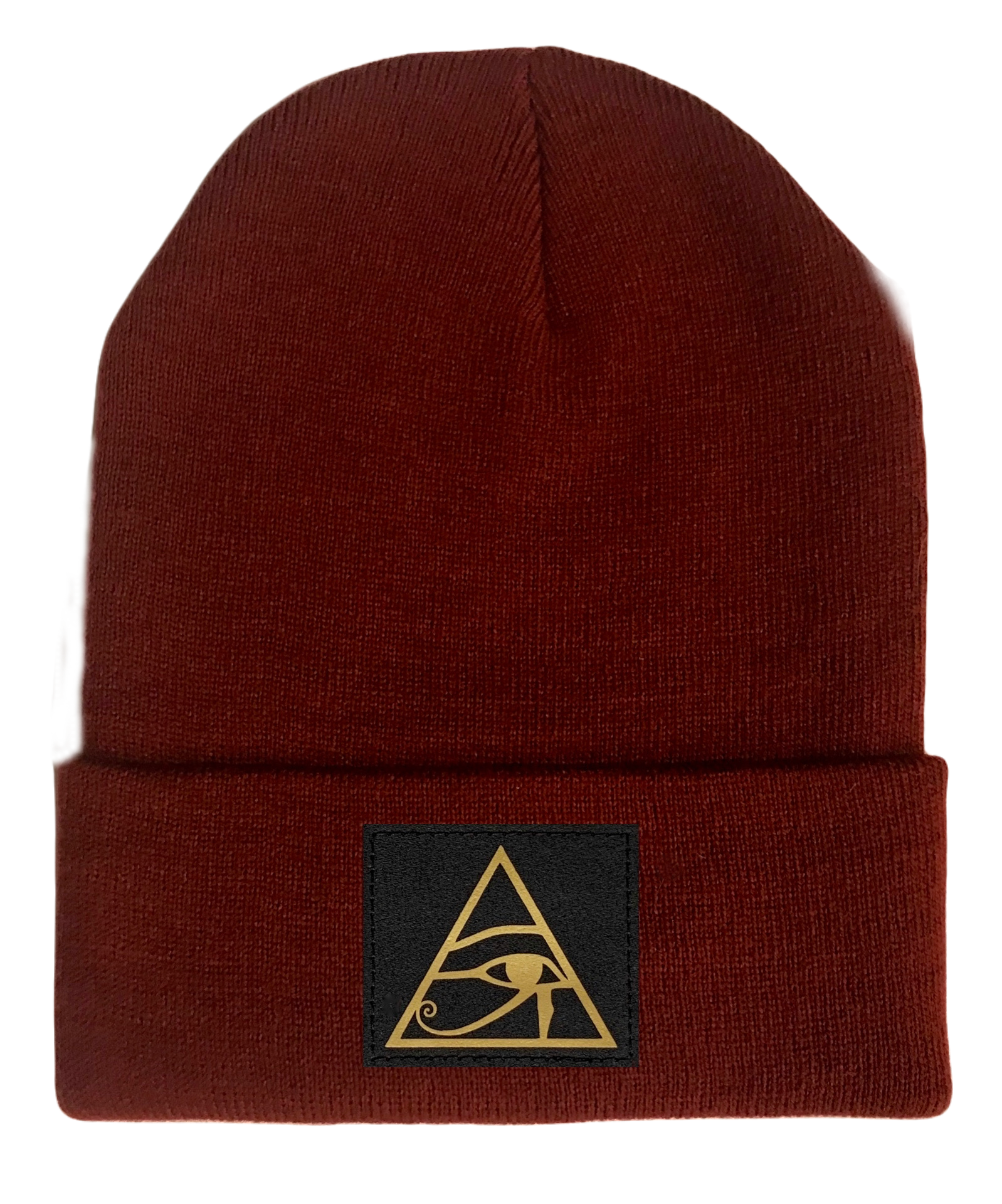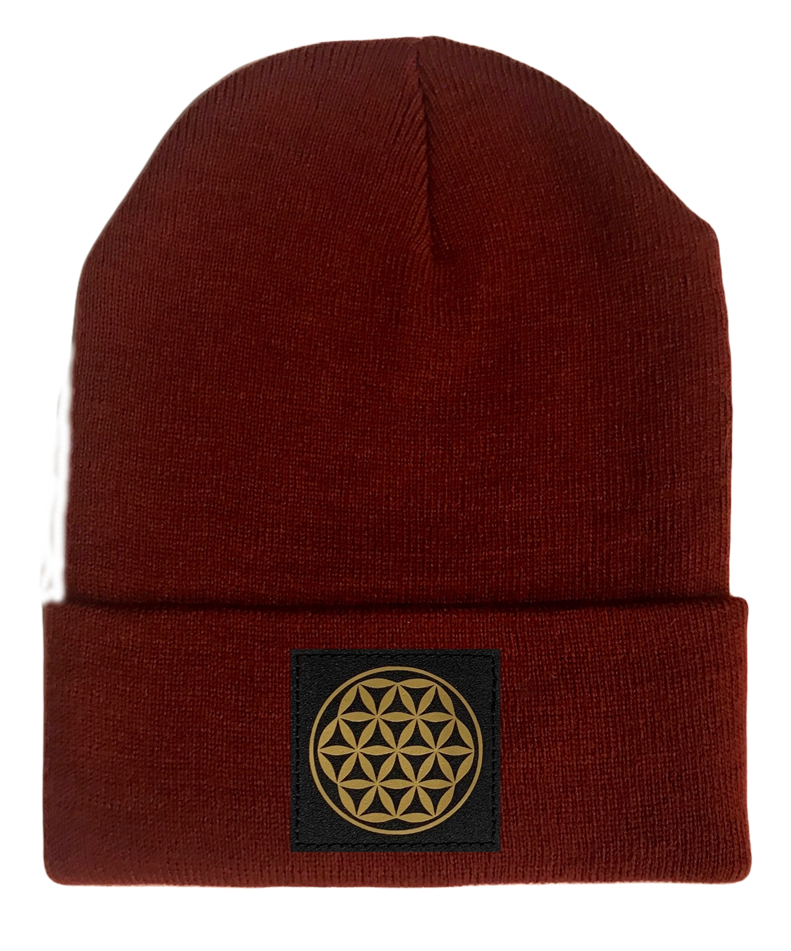 Burgundy Buddha Beanie w Handmade Cannabis, Flower of Life, Merkaba, Om, Eye of Horus, Mushrooms, Compass, Yin Yang Sun, Tree of Life, Triquetra, Ganesha, 420, Moons, Butterfly Patch over your Third Eye
